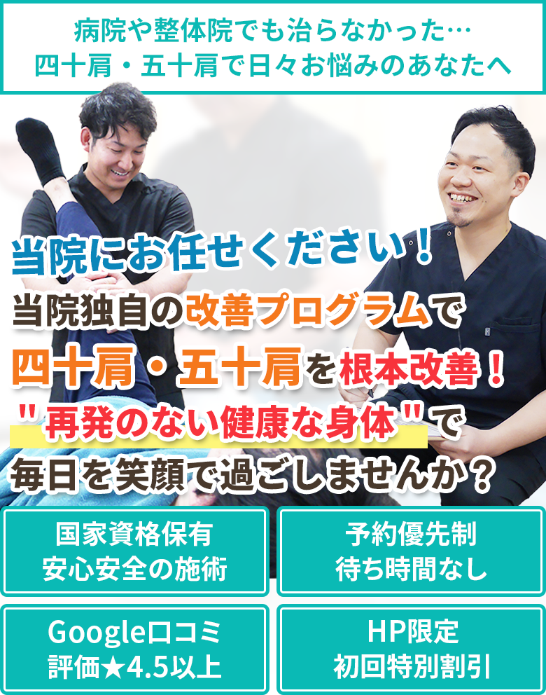 四十肩・五十肩とは多発する肩関節の痛みと、腕が上がらない、手が後ろに回せない等の運動制限が主な症状です。