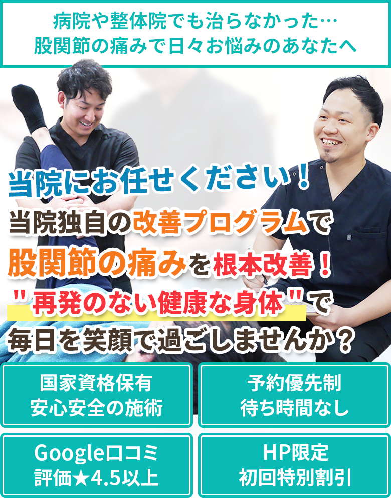 股関節に痛みが生じると日常の動きに支障がでます。